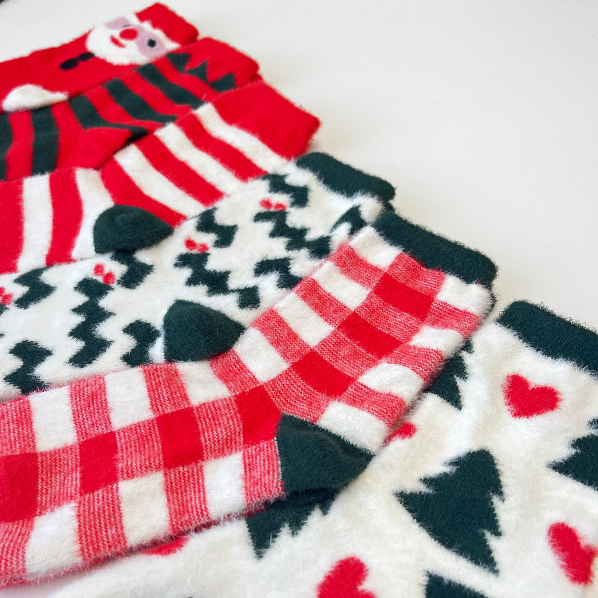 These sock set features classic holiday motifs—Santa Claus, checkers, hearts, and Christmas trees—all in a cozy red/black/white color palette, perfect for matching your Christmas outfits or adding a festive touch to daily wear