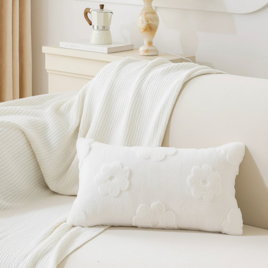 Fluffery Floral Embroidered Throw Pillow, White (12" x 20" / 30 x 50 cm)