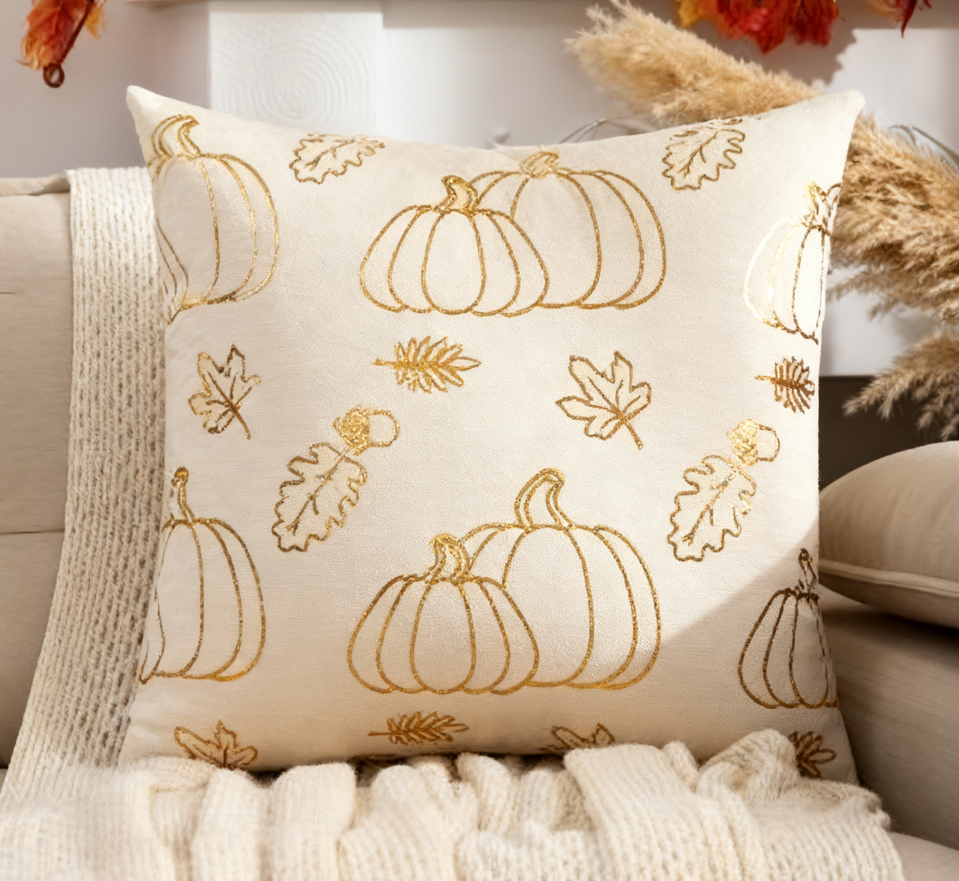 This decorative pillow is a perfect blend of autumn charm and elegance. Featuring gilded pumpkin and leaf patterns on a soft, light - colored base, it brings a touch of fall’s warmth and a hint of luxury to your space. Ideal for sprucing up sofas or beds, it effortlessly elevates the cozy, seasonal vibe of any room. The soft textured fabric offers cozy comfort while the hidden zipper makes the cover machine-washable for easy care.